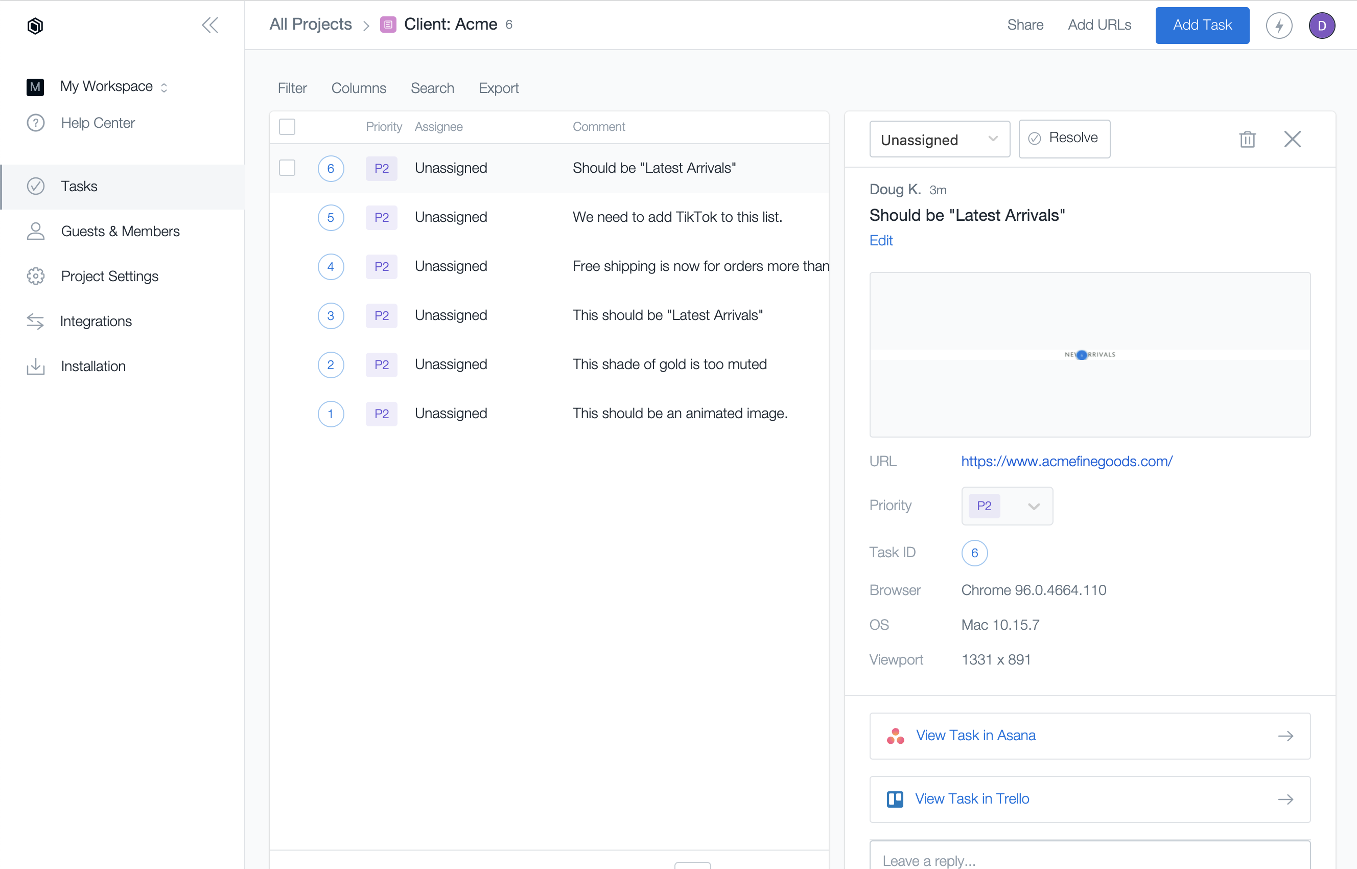 Every piece of data needed to reproduce the comment or issue gets sent to Trello including the browser, viewport size, and OS.